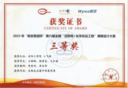 8月3日,由中国化工学会主办,浙江工业大学承办的2023年“新安集团杯”第六届全国“互联网+化学反应工程”课模设计大赛落下帷幕。本届比赛共有419支队伍参赛。我院生物工程教研室李雪丹博士带领生物工程专业的三名学生组成“小飞侠”队参加了本次大赛,经过初赛和复赛两个环节,经历了无数个日日夜夜,反复讨论和修改,最终完成了高水平的设计作品,我院学生荣获三等奖。