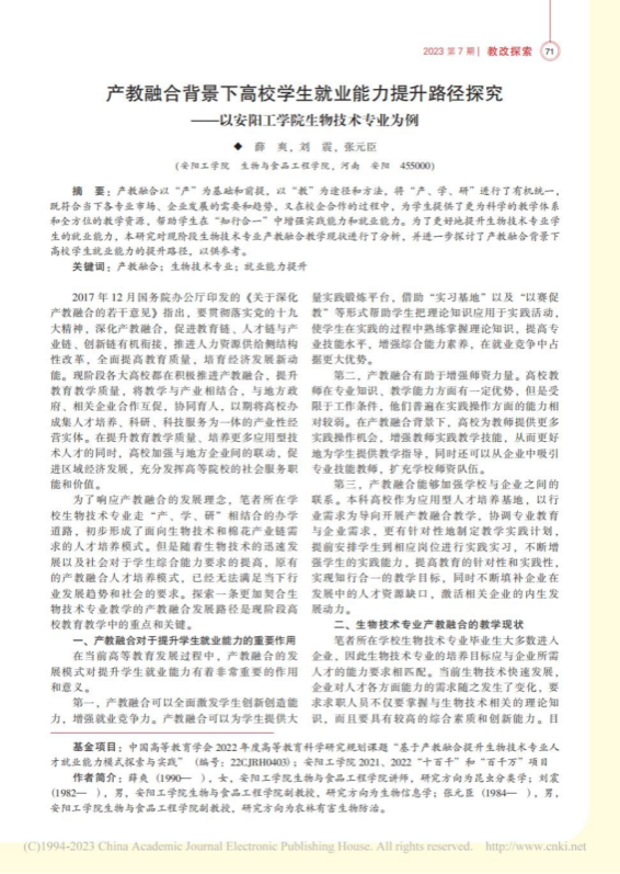 5.产教融合背景下高校学生就业能力提升路径探究--以安阳工学院生物技术专业为例,高等教育